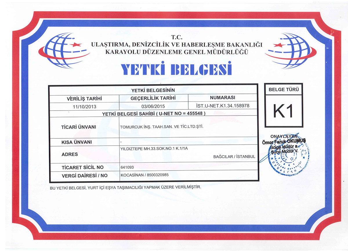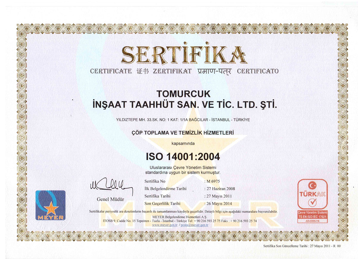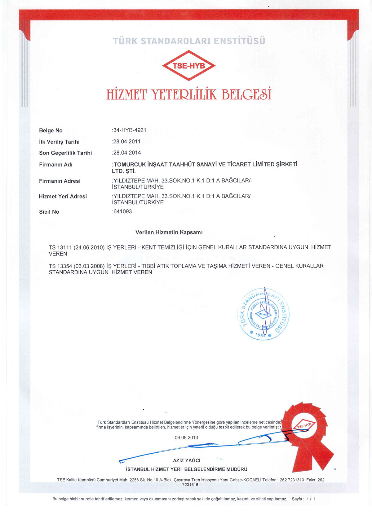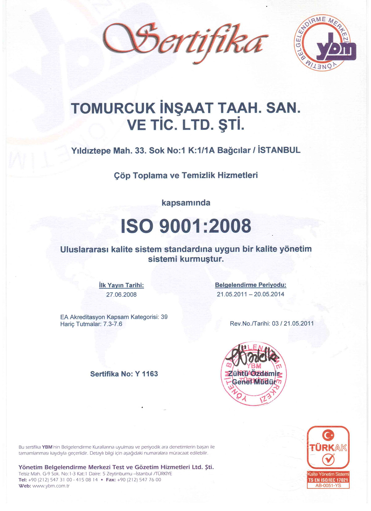 TS 13111, ISO 9001:2008 ISO 14001:2004, K1 ,Tıbbi atık toplama ve taşıma Tomurcuk İnşaat Limited Şirketi’nin sahip olduğu belgelerden bazılarıdır. Personelimizin verim ve eğitimini ön planda tutan şirketimiz bu konularda gerekli eğitimleri vermektedir.